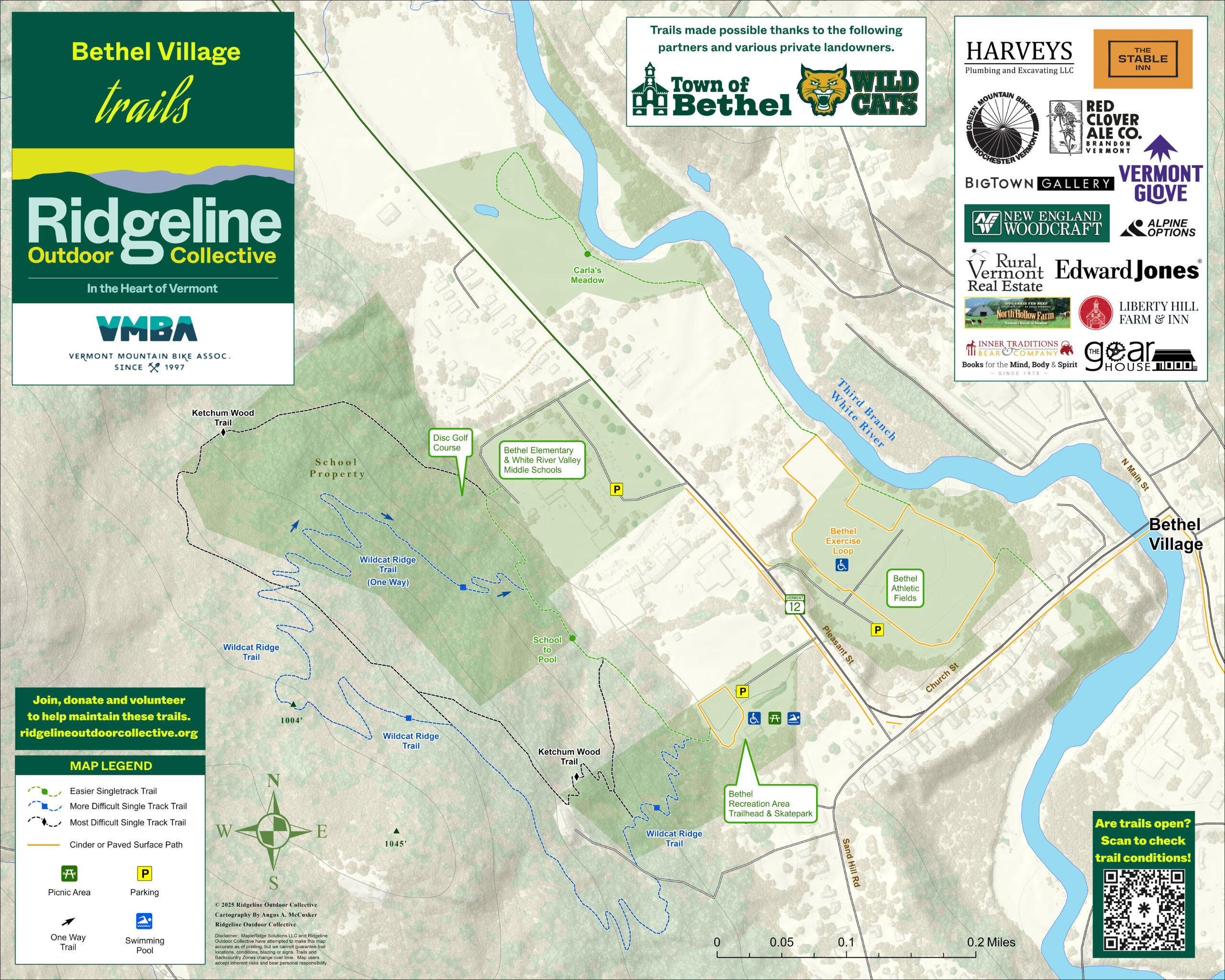 The Bethel Trail System is currently made up of two intersecting hillside trails and a connector trail behind and between the Bethel School Campus and the Bethel Recreation Area on the west side of Pleasant St (VT Route 12). There is also a riverside lollipop loop trail along the Third Branch of the White River, beginning at the Bethel Athletic Fields on the east side of Pleasant Street.
